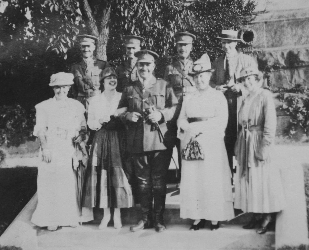 Major Carson McCormack is the officer in the front row, third from left. His mother Amelia is at the far left. Amelia was the second of Lieutenant Colonel Sharpe’s sisters, also making Major McCormack a nephew of the 116th Battalion’s commanding officer. Second from left appears to Grace McCormack, Major McCormack’s sister. Fourth from left in the front row is possibly Martha Gould. The others in the photograph cannot be identified, but they may be other relatives of the Sharpe family.