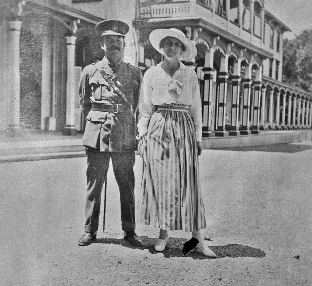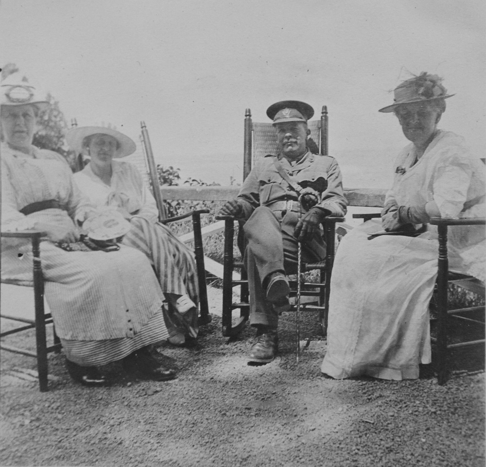 The photo below shows Lieutenant Colonel Sharpe and others relaxing, presumably at the Queen’s Royal Hotel. At left is probably Martha Gould, then Mabel Sharpe, LCol Sharpe and an unknown woman.