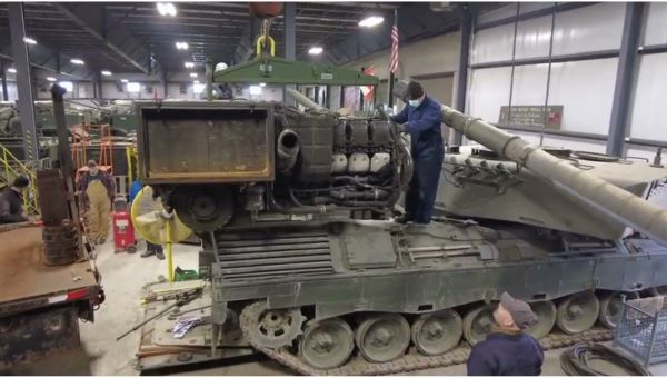 Modern tanks have everything in a single power pack. With the right equipment, mechanics like these can remove a power pack from a tank in about thirty minutes. They can then take another power pack and drop it into the tank. Then the tank can leave and the mechanics can work on the engine without crawling around in the tank.